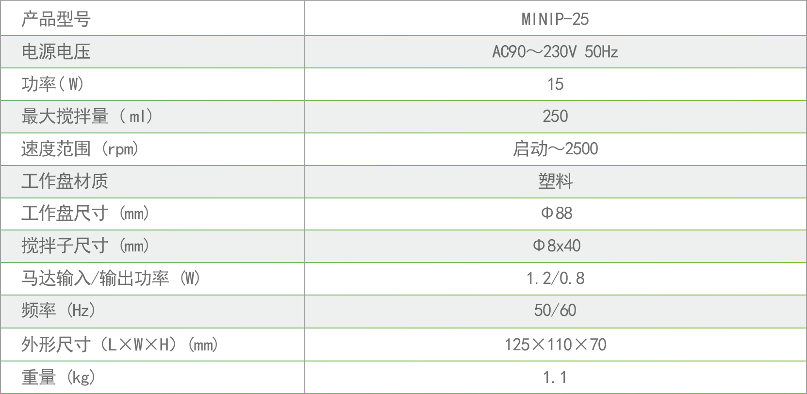 用途概述 MINIP-25迷你磁力攪拌器是一款小型便攜式磁力攪拌器,具有一流的可靠性和耐用性,廣泛應用于攪拌實驗。它適用于低粘度液體或固液混合物。當產生磁場時,驅動攪拌子旋轉,從而改善實驗效果。 產品特點 1、外觀迷你小巧,操作簡單方便。 2、無碳刷馬達,持久耐用。 3、無級調速,轉速范圍廣 。 4、強磁性,防跳子。 5、攜帶方便,滿足多種實驗需求。 主要技術參數