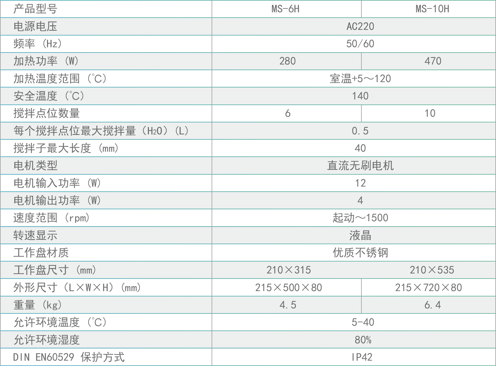 用途概述 MS系列聯式磁力攪拌器加熱型是為高效率實驗而設計的多通道磁力攪拌器,6或10個攪拌點位配置可供選擇。獨特的加熱方式,表面最高溫度可達120度。 產品特點